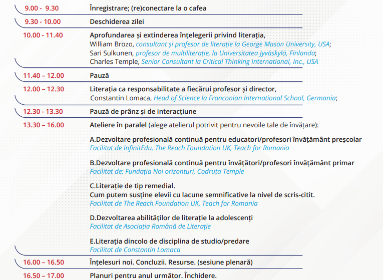 Sesiuni plenare alături de cercetători și practicieni internaționali, cu experiență de zeci de ani în domeniul literației.